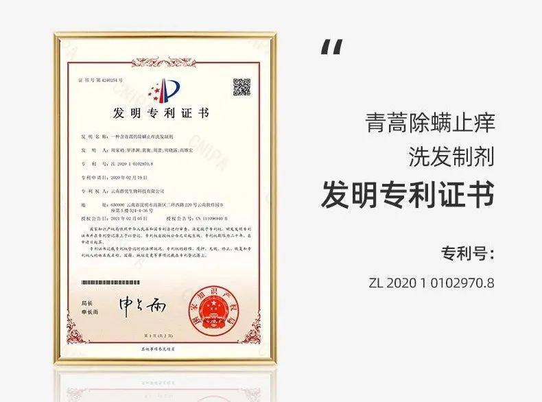還獲得了國家智慧財產權頒發的「一種含青蒿的除蟎止癢洗發水」專利證書。