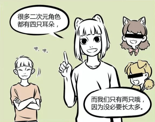 這我覺得倒是很合理,但是有時候,一些角色,明明腦袋上頂着獸耳朵,但是聽聲音卻通過人類耳朵來,接電話也是通過人類耳朵,這看着就有點違和了,這點《非人哉》的故事裡就一直處理得挺好的,諸位角色們接電話啊用耳機什麼的時候,倒是都用自己本來的耳朵來聽的。