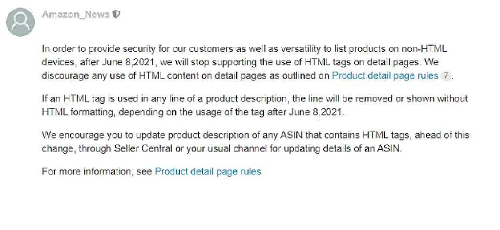 近期亞馬遜為了確保買家的安全,並提高在非HTML設備上顯示商品的通用性,宣布於2021年6月27日之後,將不再支持在商品詳情頁面的商品描述中使用HTML標記,並停止顯示其HTML格式。