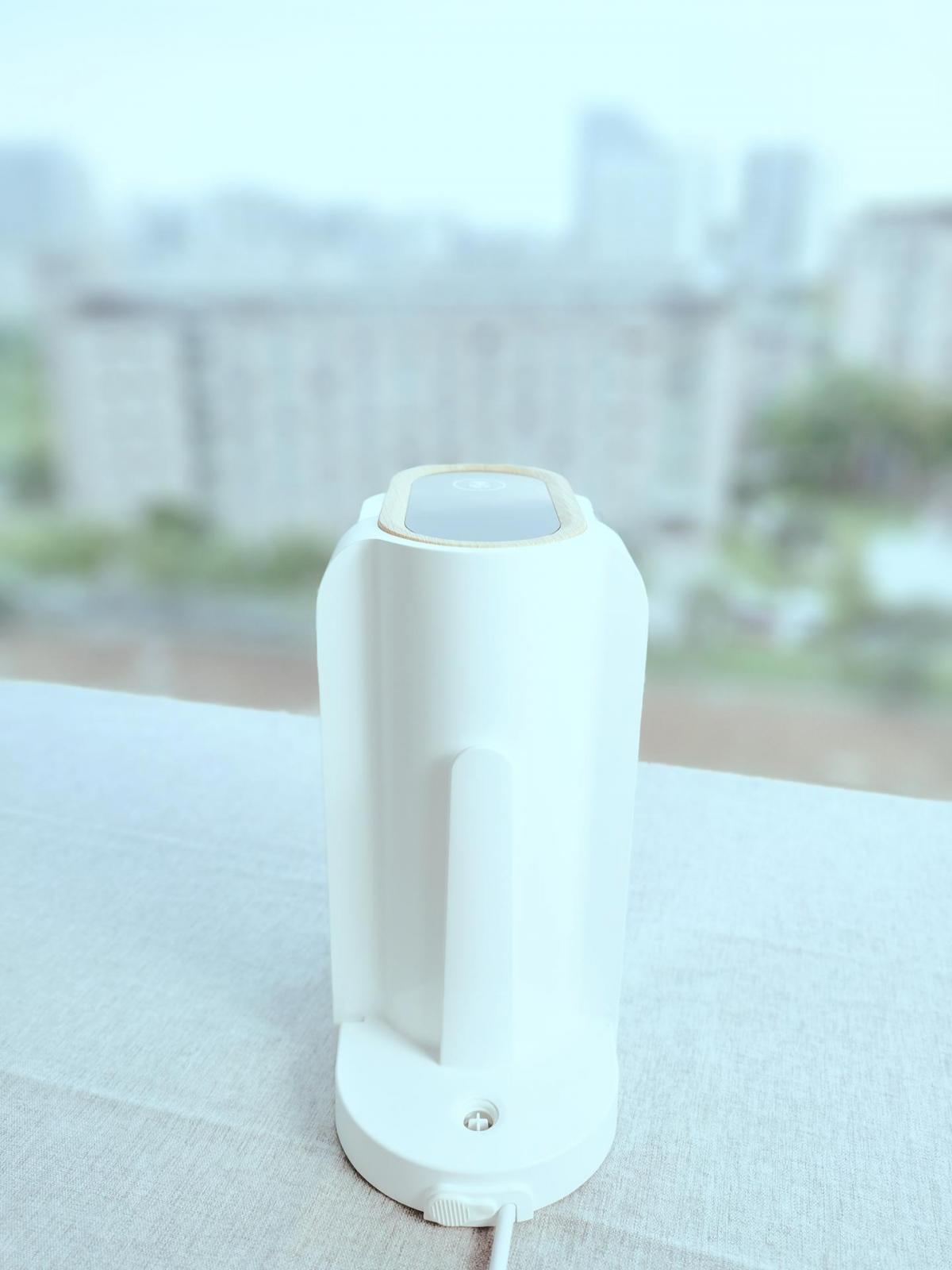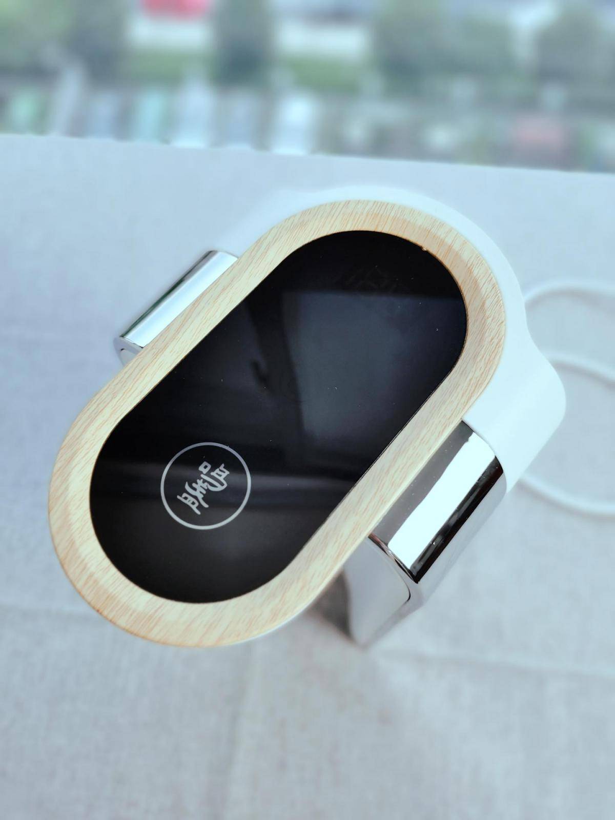 白色的機身是主體,底部有連接電源的三角插頭,頂部是黑色的觸控面板,用於啟動機器和調控水溫。整個機身的配色非常簡約,與很多家裝風格都能匹配上,不擔心放在客廳、書房或是臥室等地方會產生突兀的感覺。
