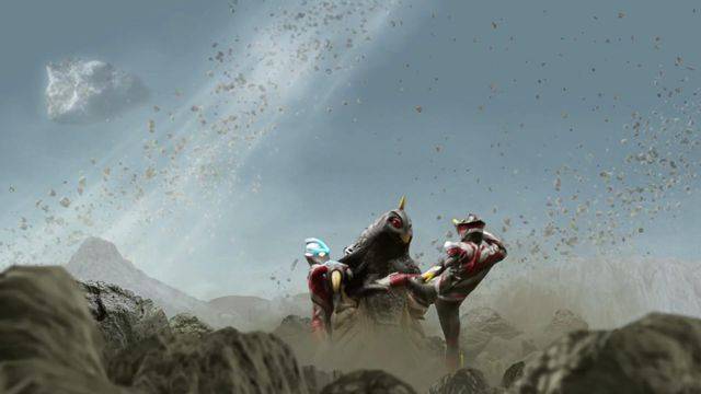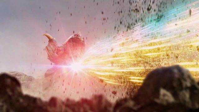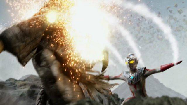 三奧開掛暴揍貝蒙斯坦,最終免不了一道光線。煜坤泰迦、斯特利姆銀河同時釋放了斯特利姆光線,煜坤泰迦是改造版,斯特利姆銀河是完全復刻,這是泰羅的必殺技能,雙重破壞光線沖向貝蒙斯坦。