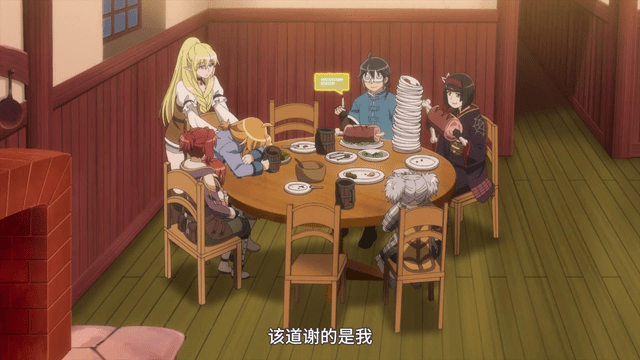 來到了新的城鎮,男主和同行者要分別了,畢竟一方是冒險者,一方是商人。分完魔物的戰利品素材後,一行人約定開個宴會。開宴會就是吃吃喝喝,男主見到了漫畫肉,內心大受感動。在吵吵鬧鬧中,宴會結束。