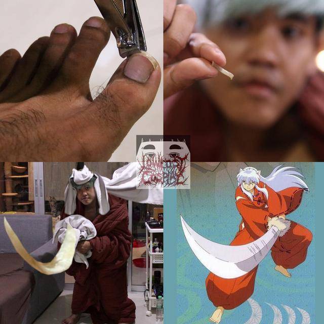 Cos犬夜叉也不例外,衣服都很好解決,用自家的衣服和被子床單之類的就完成了,但是這把刀要怎麼完成真是一個問題。但是這次的他也沒有選擇用什麼道具,而是自己的腳趾甲,利用鏡頭的那種錯位感,cos了犬夜叉。