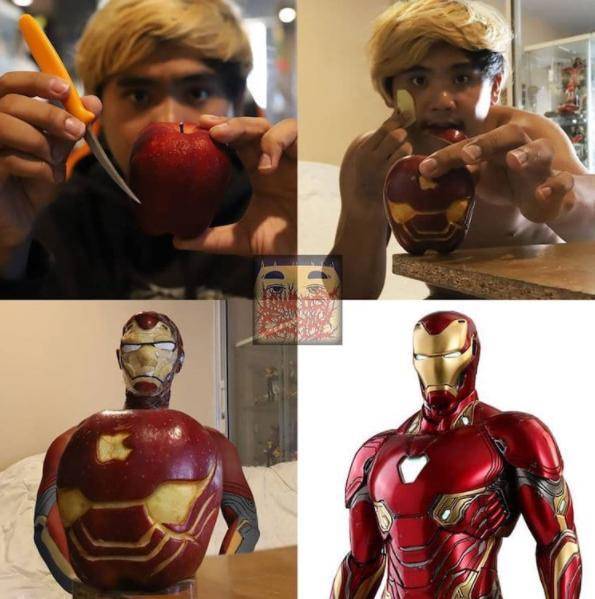 能畫出來的就堅決畫在自己的身上,或者是用膠帶和紙片來代替,如果無法完成的話就藉助一些「我們難以想像的道具」,例如這個蘋果,在小哥的cosplay當中,顯然已經成為了鋼鐵俠的身體。