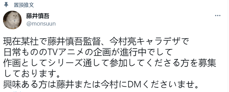 前不久,《無職轉生》的演出藤井慎吾和作監今村亮,兩人發布了同一條動態,透露了關於新作企劃的信息。新作的製作公司暫時保密,動畫由藤井慎吾擔任導演,今村亮擔任角色設計,是日常題材的TV動畫。作品正處於企劃階段,正在招募作畫人才,感興趣的人可以直接聯系藤井或者今村亮。
