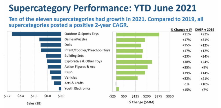 在NPD追蹤的11個玩具類別中有10個在2021年銷量上升,其中戶外和運動玩具在過去六個月中增長最快,銷售額達到29億美元,比去年增長11%,總銷售額是第二大類別游戲/拼圖的兩倍多。並且,戶外和運動玩具的所獲得的收益也是最多的,達到2.8億美元。