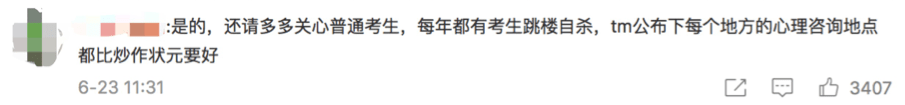正如相關新聞下的一條高贊評論所說,大家除了要恭喜那些取得好成績的考生,也應該關心那些考得不太理想的考生,避免他們一時想不開走上輕生的道路。