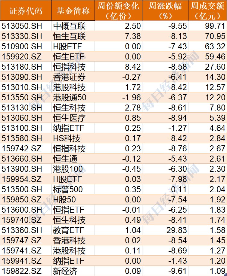 跨境ETF本周成交額超過1億元的有25隻,大部分品種出現下跌,其中教育ETF跌幅居前,下跌了29.83%;份額上,恆指科技、恆生互聯分別增加了8.42億份和7.38億份。