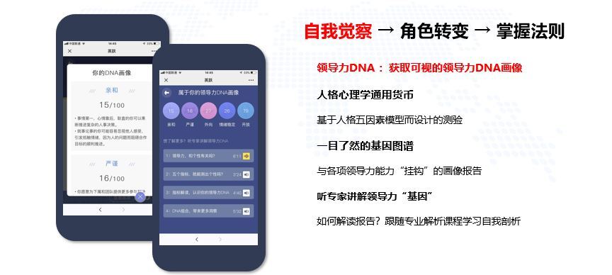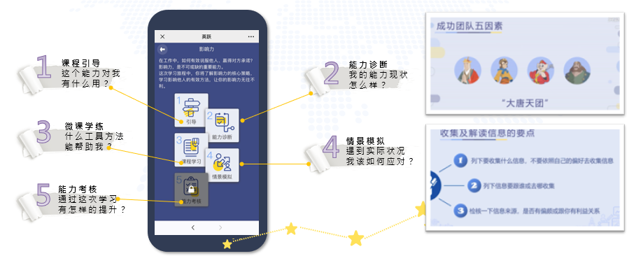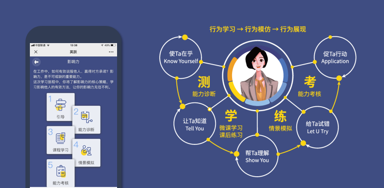 設計科學:測-學-練-考 閉環教學設計。英躍課程內置兩種類型測評:「領導力DNA」 和 「能力項內置測評」。課程學習完成後的情景模擬環節實現即學即用。