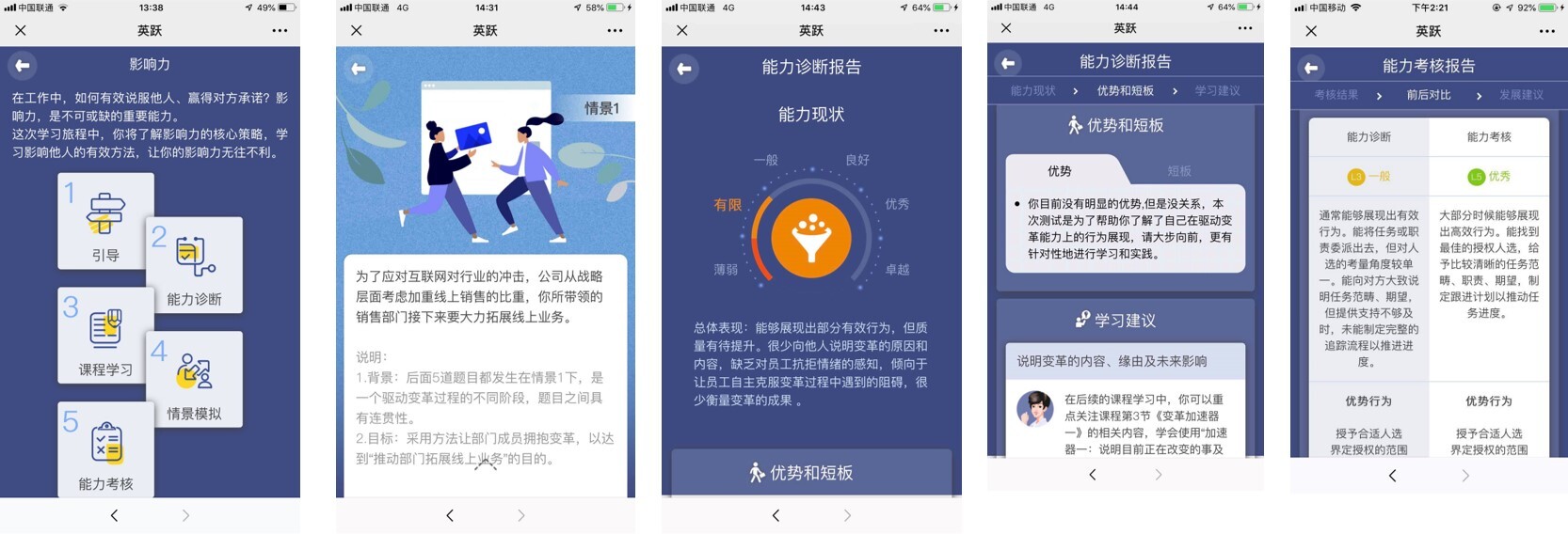 《英躍》針對中層與基層管理者必備能力設計,科學化的「測-學-練-考」閉環教學設計,使學員從了解自身優、劣勢,到針對性加強學習。附帶測試和情景演練,最終做到真正將所學領導力知識轉化為行動。