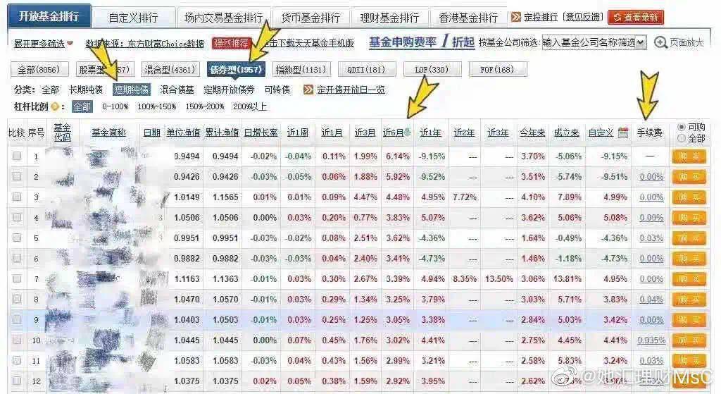 在天天基金上找到基金排行,然後選擇「債券型」,再在細分類中選「短期純債」,可以按照想看的時間段內的收益排行,旁邊還可以查手續費。