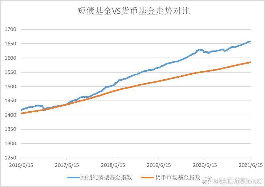 從2016年6月15日至2021年6月15日的,短期純債型基金指數和貨幣市場基金指數的走勢對比,債基看上去是不是贏了?