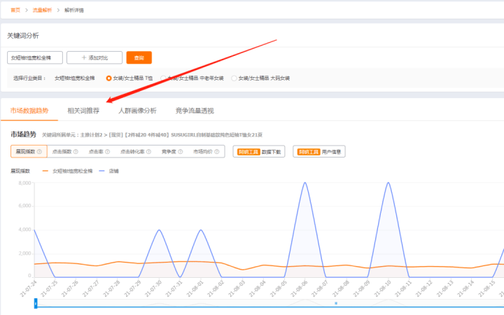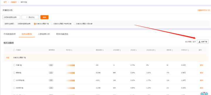 一般來講一個賺錢盈利的關鍵詞,可以找到更多和他類似相關的關鍵詞,這就是我們拓展關鍵詞的思路。那麼拓展關鍵詞的渠道也是相對來說比較多的,我們可以通過主搜下拉詞表來做拓展關鍵詞,同時還可以直接在直通車中點擊這個關鍵詞,進入到流量解析下載對應的詞表。