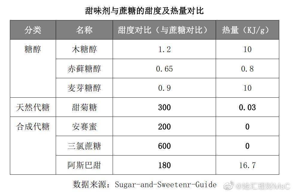 只要一點點的人工甜味劑,就能甜出天際,口感不差於蔗糖,而熱量幾乎為0。我們看下比較常用的甜味劑的甜度和熱量數據: