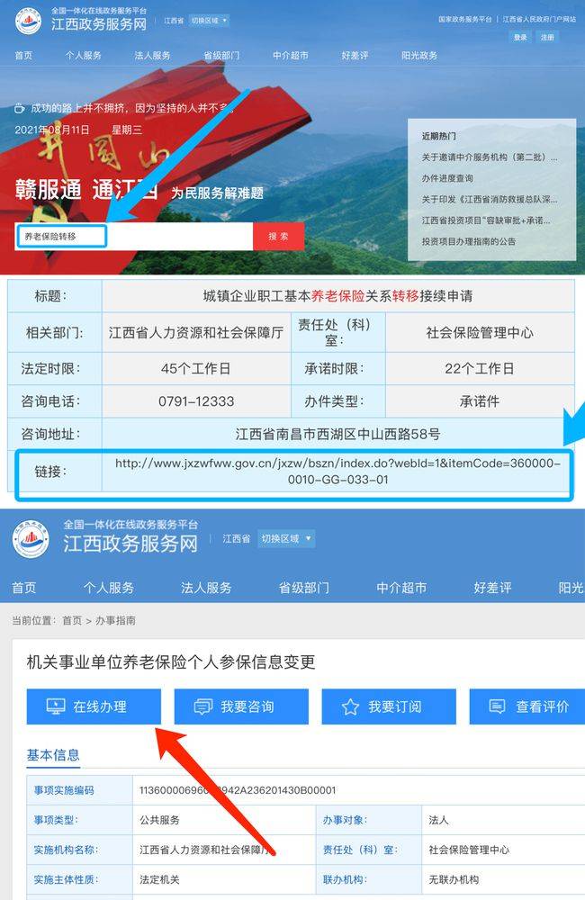 登錄江西政務服務網,搜索【養老保險轉移】,然後選擇對應的入口,進行在線辦理即可——