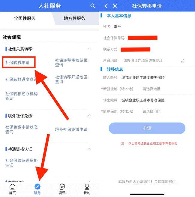下載注冊後,直接點擊【服務-社保轉移申請】,然後按流程操作即可——