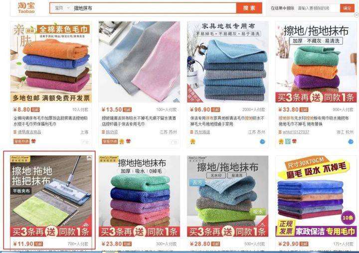 大家看上圖,搜索詞是:擦地抹布,從詞義就可判斷出這個產品是抹布,而且是用來擦地的抹布,可從搜索結果頁來看,8個展示位只有左下角紅框出來的這位商家,用場景化的圖片清晰的展示出了產品本質功能,同時又巧妙的與相鄰產品做出了差異化視覺效果。而其餘7家產品只會機械的通過產品疊放來展示產品,根本看不出來與「擦地」的關聯,雖然從攝影和美工的角度來說,圖片本身並不差,但從詞圖匹配的角度,這樣的圖片顯然效果比左下角的圖片要差好多,加上雷同沒有差異化的構圖,點擊率可想而知高不到哪裡去了。所以,再次強調,好的產品圖片是策劃出來的,未必高大上,與產品賣點越匹配越好。