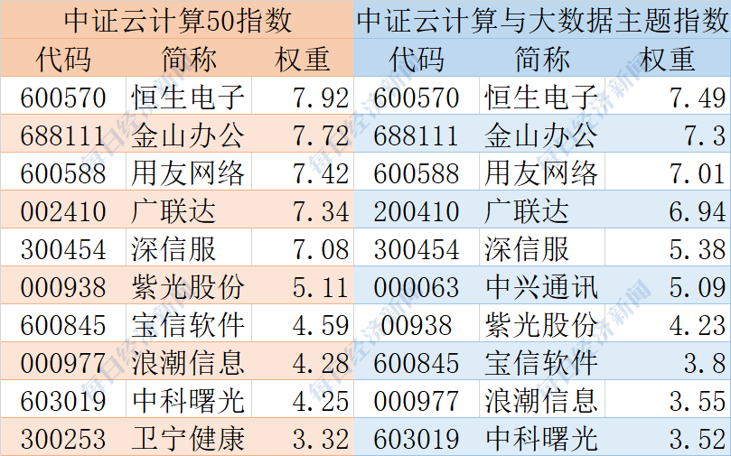 目前和中證雲計算50指數成分股大量重疊的是中證雲計算與大數據主題指數,頭號權重股均為恆生電子,前十大權重股中,有9隻相同;從近三個月漲幅看,兩個指數分別漲4.64%和5.14%。