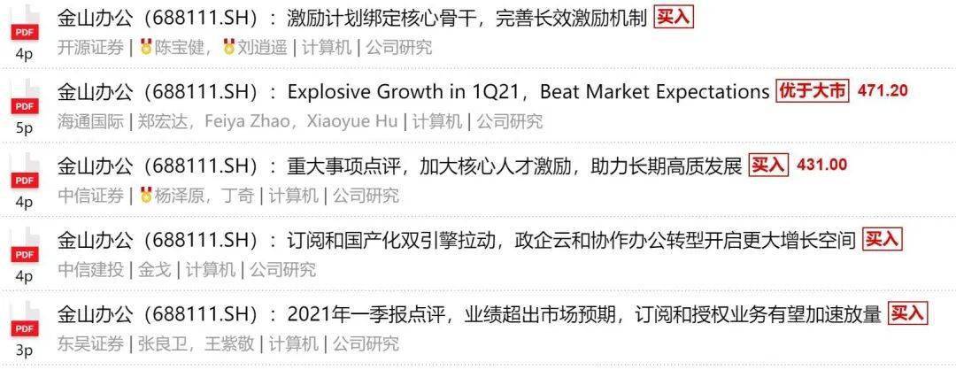 而有意思的是,在金山辦公5月份股價反彈階段,多家券商紛紛發布「買入」評級的研報,更有兩家券商的目標價看到471.2元和431元。