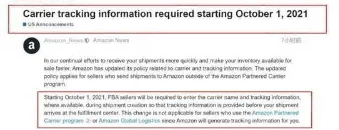 亞馬遜美國站近日發公告稱,從2021年10月1日開始,FBA賣家將被要求在創建運輸貨物期間輸入承運人名稱和物流追蹤信息(如有),以便在賣家的貨物到達履行中心之前提供跟蹤信息。