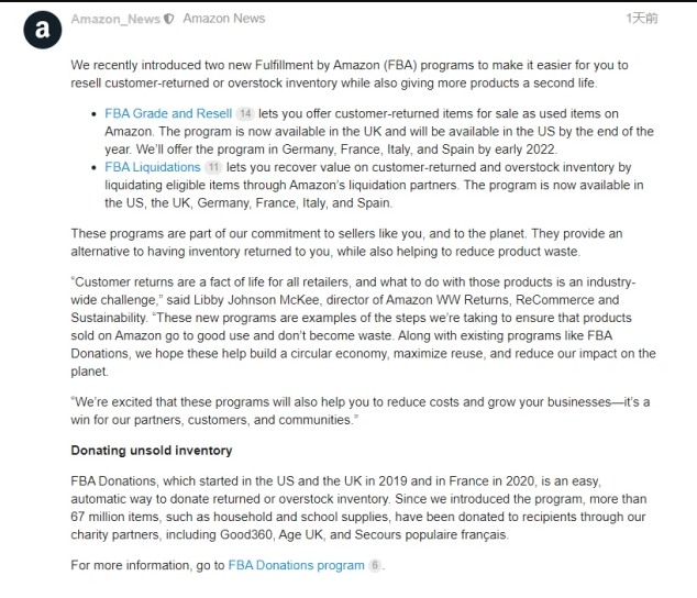 (1)退還商品二手轉售計劃。賣家可以藉助亞馬遜物流評級和轉售,在亞馬遜商城將買家退還的商品翻新後作為二手商品出售。目前該計劃已在英國商城推出,並將於今年年底在美國商城推出,同時亞馬遜方表示該計劃將於2022年初在德國、法國、義大利和西班牙商城推出。