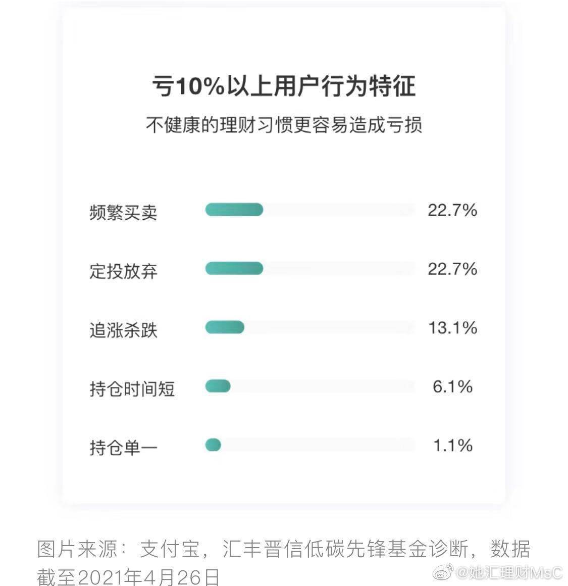 以匯豐晉信低碳先鋒為例,支付寶的基金診斷功能中顯示,虧損10%以上的基民中有近 1/4的小夥伴是因為放棄了定投。