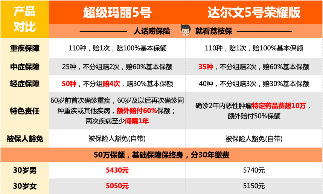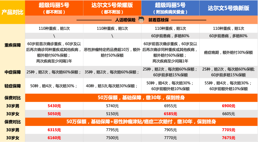 而對比表的右邊是超級瑪麗5號附加60歲前患病額外賠付後,跟達爾文5號煥新版對比的情況。