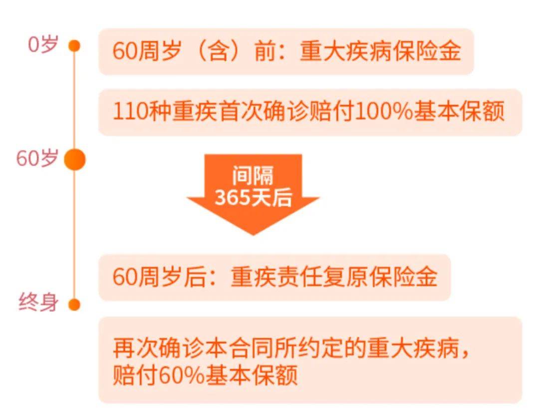 簡單來說就是60歲前得重疾賠過一次,要是60歲之後又得重疾,不管是復發還是新發,都能再賠60%的保額。