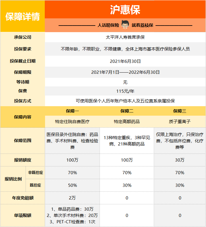 而滬惠保每年免賠2萬,最多報銷100萬。