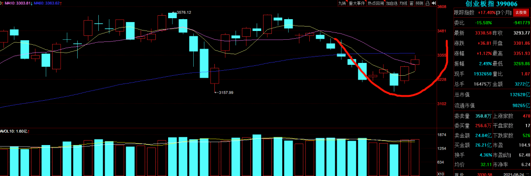 創業板也是回到60日均線附近,技術形態上有機會走一個圓弧底。